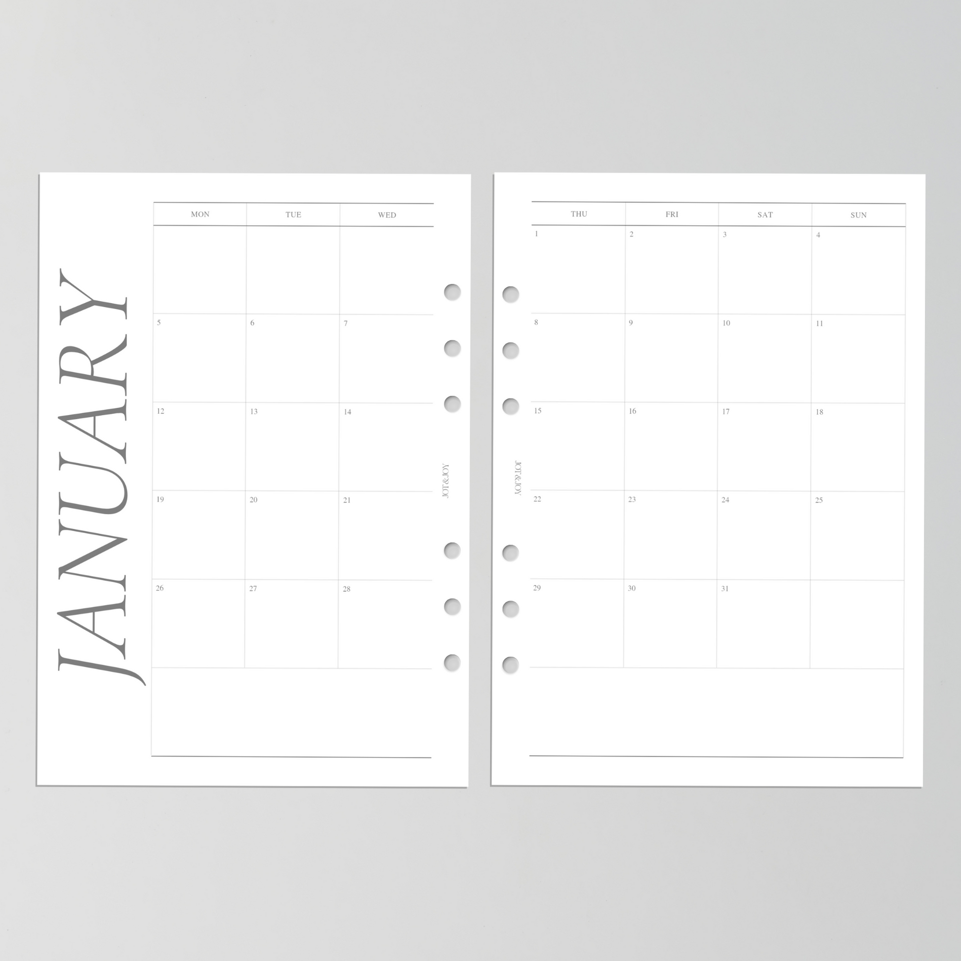 Plan your year with clarity and purpose using our 2026 Monthly Planner Insert Set - a minimal, functional layout designed to help you stay organised all year long. Featuring all twelve months from January to December 2026, each month is thoughtfully laid out on a two-page spread, offering a clean monthly overview with space for notes and planning.