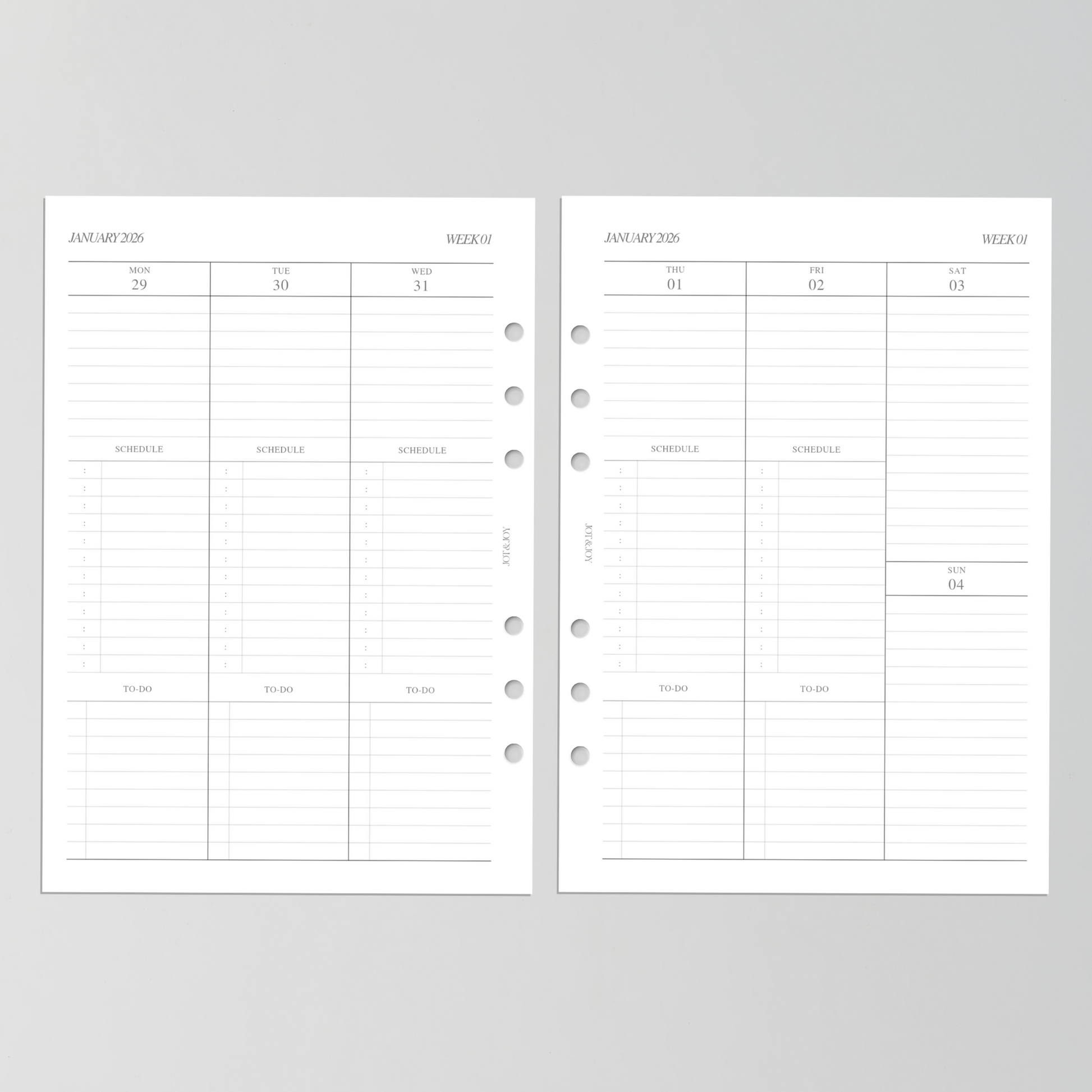 Plan your year with clarity and purpose using our 2026 Weekly Planner Insert Set - a minimal, functional layout designed to help you stay organised all year long. Featuring all 53 weeks (no, that isn't a typo! There really are 53 weeks in 2026) from January to December 2026, this vertical layout weekly overview is perfect for those with busy schedules, meetings and to-dos.